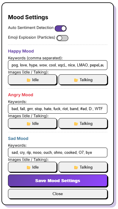 - ๐ญ Dynamic Mood System: Define custom keywords (or emotes) to automatically change your petโs expression or trigger Screen Particle Explosions (Hearts, Fire, etc.).