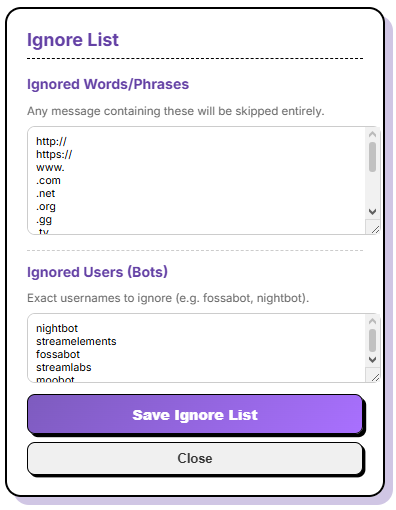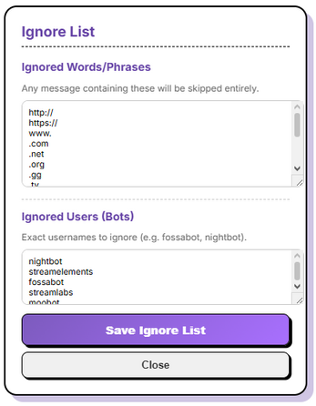 - โ Ignore List: Filter out specific words or users from being read.